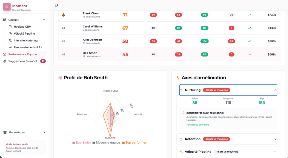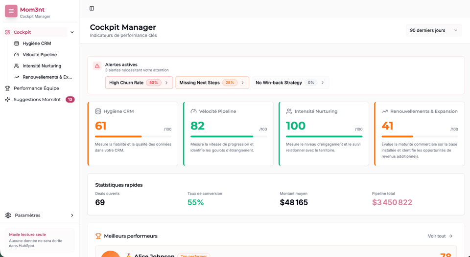 L’angle différenciant de Mom3nt s’est matérialisé dans le produit : combinaison de données internes (CRM et emails) et de données externes (web), approche AI-first orientée agents spécialisés, focus sur des cas d’usage business concrets (sales performance, messaging), et intégration directe dans les outils existants des commerciaux.