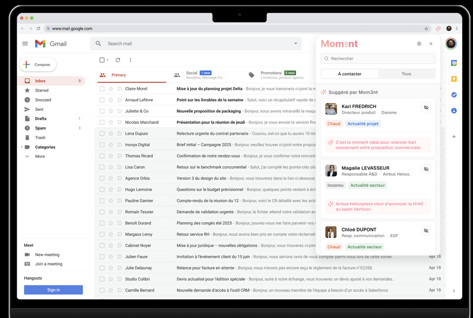 Un outil de sales nurturing n’a de valeur que s’il est là où le commercial travaille déjà. On a développé une extension navigateur qui projette Mom3nt au cœur du workflow utilisateur, directement dans Gmail. Le commercial voit les contacts à relancer, les suggestions de messages et les signaux détectés sans changer d’outil.
